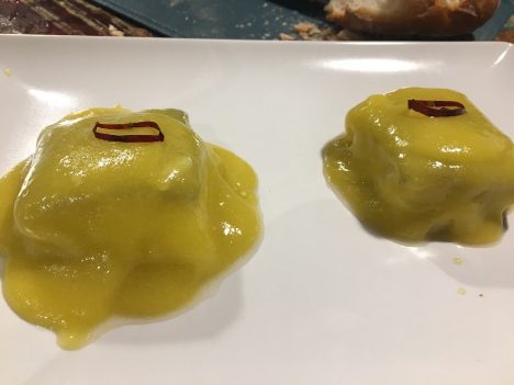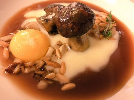 Seguimos con un clásico que no falla, el salteado de vainas con lascas de bacalao y espuma de patata Y los primeros hongos del otoño, hechos a la parrilla, presentados de forma divertida como si fueran chapelas y acompañados con yema de huevo, salsa de pato y piñones. Impecables los boletus por punto y textura. Algo más flojos los chipirones de potera a la parrilla con una crema ligera de pochas.