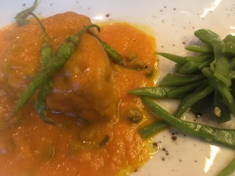 En mi última visita empezamos con una magnífica morcilla de Beasaín, que como saben está suavizada con puerro, y muy buenos pimientos del piquillo asado. En Arima se cuidan mucho los platos de cuchara. Lo compruebo con unas sabrosas pochas con bacalao y almejas, plato del día. Apurando la temporada, bonito con salsa de tomate casero y vainas. El pescado, simplemente vuelta y vuelta, muy jugoso. Y sobresaliente la salsa de tomate tradicional.