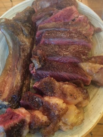 Fiel a la tradición, Nagore tiene siempre chuleta de vaca vieja. La que probamos es una carne de calidad, con mucho sabor, pero algo dura. Como acompañamiento una ensalada de esa estupenda lechuga guipuzcoana que por sí sola merece la pena. Para rematar, una pequeña tabla de quesos bien seleccionada, que incluye comté, uno de cabra holandés o un buen stilton. Carta de vinos breve pero bien seleccionada. Ya en enero les dije que era un sitio para seguir de cerca. Ahora se ha consolidado definitivamente.