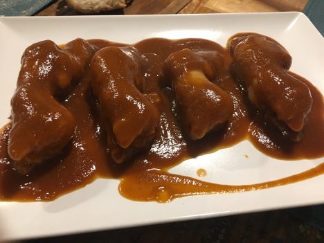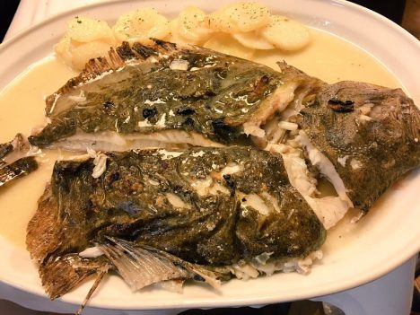 Jugosos, impecables, los lomos de merluza rebozados y fritos, acompañados con sus preceptivos pimientos asados. Muy logrado el bacalao al pilpil, perfectamente ligada la salsa, aunque perjudicada por un aceite demasiado amargo. Y magníficas las manitas de cordero, con una vizcaína de libro. Probamos además unas mollejas fritas, servidas sobre un puré de patata para suavizarlas.