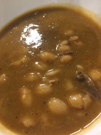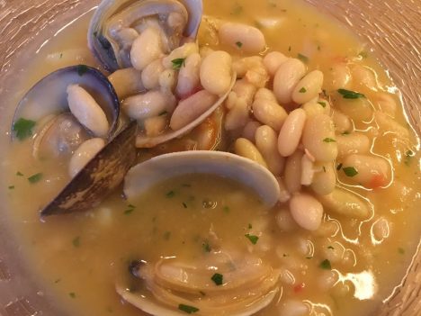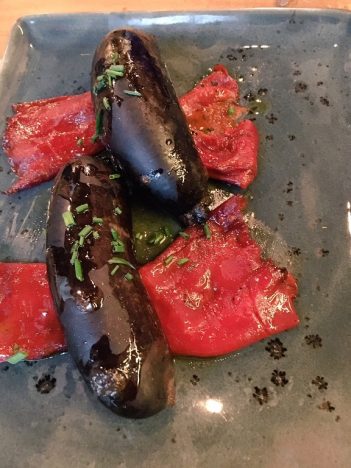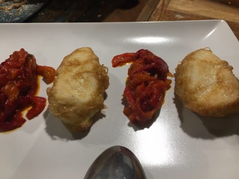 El propietario y cocinero es Alberto Vélez, bilbaíno, que entre otras cosas fue jefe de cocina de los hoteles Ercilla, y que me ha parecido un profesional muy sólido, que borda esos platos de la cocina vasca de siempre. Como aperitivo unos hongos salteados y unos pimientos verdes fritos. Y luego un guiso de pochas con rabo de toro, estupendo.