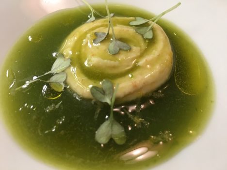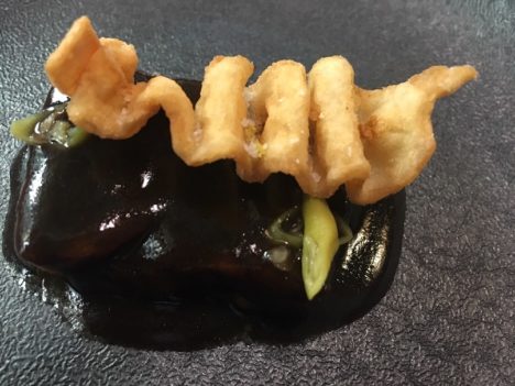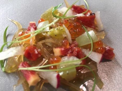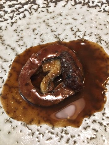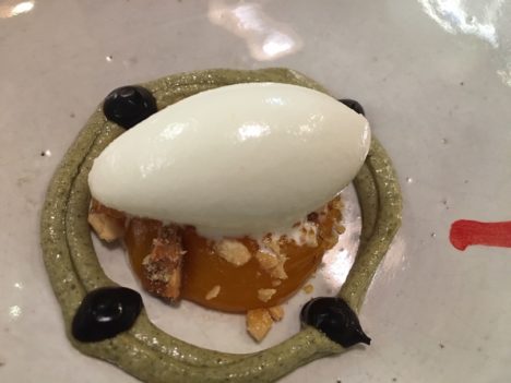 Y vamos con el largo menú que me sirvió y que empezó de una manera un tanto dubitativa con los snacks. Acertados el ya tradicional tarro de encurtidos que deja en la mesa mientras el cliente va decidiendo lo que comerá y un estupendo buñuelo de bacalao. Sin embargo, insulsa la sangre encebollada y anodino el pan suflado con sardina y vermú. A partir de ahí la cosa se entona. Agradable el jugo de ostra con wakame y helado de kimchi, sabor a campo las logradas láminas de ciervo en salazón con praliné de almendras y hierbas de monte e intensidad en la ensalada de sardina de bota con tomate a la que aportan frescor y contrastes el hinojo, los rabanitos y unos higos.
