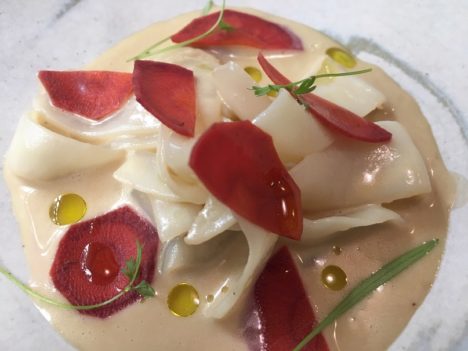 Tras un bajón con unas confusas láminas de vieira en salazón con tocino y tirabeques y bañadas en salsa holandesa llega uno de los platos más sobresalientes de la temporada, el aguachile de chirivía y erizo, con un ligero toque picante. Desde sus inicios, a Patiño le ha gustado utilizar caldos y fondos. Sigue haciéndolo en la mayor parte de sus platos, pero ahora con mayor refinamiento. Y este aguachile es un buen ejemplo. Como lo es otra elaboración que está en el póquer del menú, un escabeche templado de sepia y zanahoria. El escabeche, casi una emulsión, arropa perfectamente a la sepia laminada, que aporta una peculiar textura.