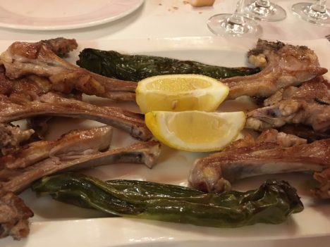 Estupendo el pisto de verduras locales con huevo, un fijo de la casa. Como lo son las patatas Pastor (el nombre responde al apellido de María Ángeles, que es la cocinera), con nata y jamón y luego gratinadas. Memorables. No me extraña que sea el plato más vendido a lo largo del año. Rematamos con unos taquitos de congrio rebozados y unas estupendas chuletillas de cordero a la brasa, con unas patatas fritas caseras como Dios manda y pimientos verdes fritos. Obligado el queso curado de la tierra antes de probar un par de postres que están un poco por debajo del resto. El mejor la tarta de queso.