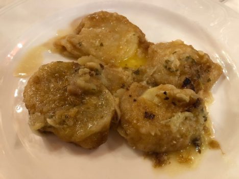 Empezamos, claro, con los espárragos. Que se pueden tomar solos, sin más añadido, o con un chorretón de buen aceite de oliva virgen extra. El que tienen en esta casa se elabora también en Tudela. Pero hay mucho más. De las huertas de la localidad salen también unas estupendas alcachofas. Según Mariano, las que nos sirvieron no eran de allí. En cualquier caso, las tomamos salteadas con jamón y estaban muy buenas. Frescas y muy ricas las pamplinas, simplemente aliñadas. Cada vez me gustan más estas hierbas de campo que como saben también se conocen como corujas o marujas.
