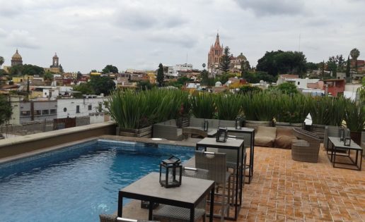 NEXTIA. En el lujoso y coqueto hotel Nena de San Miguel de Allende, con sólo siete habitaciones y una terraza espectacular por sus vistas (foto superior). Antes de comer suban a tomarse allí un tequila o una cerveza de aperitivo. El restaurante, con capacidad para no más de 20 comensales lo lleva Alonso Domínguez, hijo mayor de Bricio. Buena cocina mexicana actual. Sólo pude probar tres platos ya que la idea era conocer más sitios. Me gustó el tiradito de callo de hacha, aunque no el camarón laqueado con salsa barbacoa que lo acompañaba, excesivamente pasado de cocción (al gusto mexicano), en una mezcla algo extraña. Estupendo el caldo guanajuatense a base de carne de lechón, xoconostle, chile ancho, cebolla, tequila y limón. Complejo contraste de sabores. Y muy bien también el chile guajillo relleno de cordero con salsa de almendras y queso de cabra.