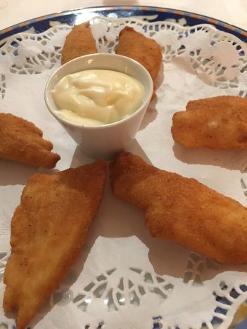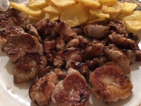 Paco insiste en que probemos una de sus especialidades, el gallo san pedro rebozado y frito. Los filetes limpios de espinas, con el rebozado impecable y sin gota de grasa. En el centro de la fuente un recipiente con mayonesa para mojar, pero no hace ninguna falta porque el pescado está jugoso y tiene sabor. Le siguen unas ortiguillas, el único fallo de la noche ya que algunas tienen arena. Una lástima porque de nuevo el punto de la fritura es irreprochable. Nos ofrece luego Paco unos riñones de cordero lechal. No lo dudamos. Cada vez más difíciles de encontrar, para mí son un bocado exquisito. Me entusiasma la casquería en general, pero estos riñoncitos son una auténtica debilidad. Bien dorados, envueltos en su grasa, con buenas patatas fritas al lado, nos comeríamos varias raciones.