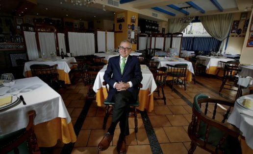 El alma de Cabo Roche es Paco Jacquot (en la foto que encabeza el post), un veterano de la hostelería sevillana. Ahora cuenta con la importante ayuda de su hija Macarena, que lleva ya con acierto buena parte de las riendas del negocio. Ambos derrochan amabilidad a raudales. No conocía personalmente a Paco, nunca había estado en su restaurante, pero en cuanto me vio cruzar la puerta vino lanzado a saludarme y a confesarse lector de todos mis artículos. Algunos casi se los sabía de memoria. Así que con el ego reforzado cayeron las primeras manzanillas en la barra que tiene en la entrada. Y de allí al amplio comedor, apenas separado por unos biombos. Decoración ecléctica, con un poco de todo. Lo mismo maquetas de barcos pesqueros en estanterías que cajas de vino apiladas. Y fotos. Muchas fotos en las paredes. De personajes más o menos célebres que han pasado por allí.