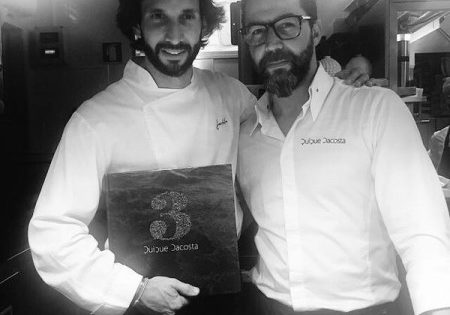 De los que preparó Quique (con mucho mérito al ser cocina ajena, aunque contó con el importante refuerzo de su mano derecha, Juanfra Valiente, y de Carolina, una de sus jefas de partida) me gustaron mucho, además, claro, del arroz y de la gamba, los pétalos de rosa y el gin tonic de manzana de aperitivo; el juego con las hierbas encurtidas (raim de pastor); el delicado mochi de torta del Casar y trufa; el satay de centolla (aunque se le fue la mano en la cantidad y resultó demasiado pesado); y ese originalísimo huevo en cenizas que es una de sus novedades de este año y que refleja la creatividad y la enorme técnica del de Denia.