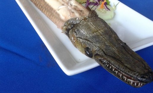 Pero la gran especialidad de Tabasco en lo que a pescados se refiere es el pejelagarto o pez lagarto (foto que abre este post), un bicho de aspecto repulsivo. Los preparan enteros asados, en salpicón o en ensalada. Preguntamos por el más tradicional y es el asado. Así que a la mesa llegó, como pueden ver en la imagen, el pez entero, con esa tremenda cabeza de lagarto y el resto del cuerpo pelado y listo para ir troceándolo para comer en tacos. Por la textura de su carne, que recuerda a la de la lubina o similares (aunque más basta), y por la cantidad de espinas, es un pescado. Sin embargo tiene un acusado sabor a pollo, como ocurre con la carne de lagartos o de cocodrilos. Muy curioso. Con varias cervezas y un postre hiperdulce, 30 euros por cabeza. No es Tabasco un destino muy habitual para los visitantes de México, pero si pasan por Villahermosa, su capital, recuerden este sitio. Les gustará.