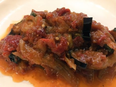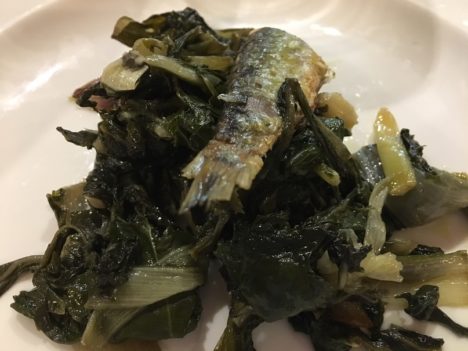 En un menú popular no podía faltar el zarangollo (foto que encabeza el post), ese revuelto de calabacín y cebolla con mucho sabor. En Salzillo lo hacen de lujo. Y más verduras de la huerta murciana, en este caso en forma de pisto. Muy reducido, casi caramelizado, resultó espléndido. Para cerrar este bloque un plato que nunca había probado y que, según me cuentan, se come habitualmente en las casas: acelgas fritas con ñoras, ajos tiernos y sardinas saladas. Hay que tener cuidado con las sardinas, potentísimas, pero empleando la cantidad justa me pareció una combinación magnífica, la espléndida sencillez de la cocina popular bien hecha.