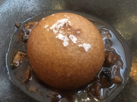 Interesante el juego vegetariano de crucíferas, musgo, caldo de raíces y kale reforzado por un kashmiri masala (mezcla de especias suaves). Por contra, el falso suflé de huitlacoche, cristal de kikos y queso Morbier es una combinación fallida, cada cosa por su lado. Y el estofado de setas (que combina cultivadas y salvajes) se malogra por un coulant de yema campera con el huevo completamente cuajado. Un fallo técnico en el punto que estropea lo que podría ser un buen plato.