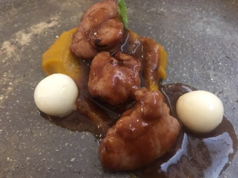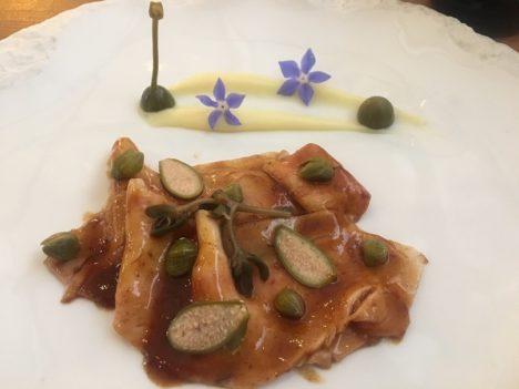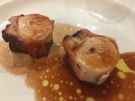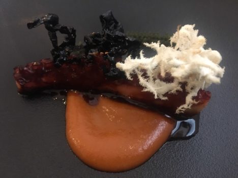 Largo apartado de entrantes que comienza con un muy buen carpaccio de ijada de atún en semisalazón de agua de mar con alga codium y seta de cardo ecológica. López cultiva sus propias setas de cardo para emplearlas en algunos platos. La camarera las muestra en la mesa al principio de la comida. Volvemos a los altibajos. Entre lo mejor, el pulpo al kamado con crema de sobrasada, interesante combinación, y las chapinas (mollejas) glaseadas con calabaza totanera a la brasa y ñoquis de romero. Dos muy buenos platos.