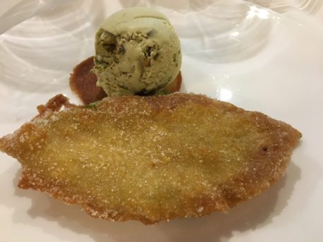 Me interesó menos el huevo pochado con setas de temporada, un plato que, por lo visto, tiene un gran éxito en Salzillo. Estaba bueno, pero no aportaba nada. Francamente bien una lubina abierta, hecha a la murciana, en la brasa, ejemplo de los buenos pescados de la costa de esa región. Y de postre, inevitable, otro clásico de Murcia: el paparajote. Ya saben, una hoja de limonero envuelta en una masa de harina y huevo que se fríe. La hoja aporta un sabor cítrico a la masa. Muy buenos los que nos sirvieron, acompañados con un helado artesanal de pistacho. Acompañamos todo con un par de vinos de Jumilla, cada vez mejores. Me gustó especialmente El Molar, de Casa Castillo.