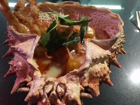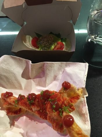 En el resto de cosas ya no puedo coincidir con mi colega del Evening Standard. Es evidente que la decoración es excéntrica, y que las aparentes camisas de fuerza que visten los cocineros llaman la atención. Pero vuelvo a los que decía antes. El show, aunque no nos guste demasiado, y Dabiz forman un todo. En cualquier caso me gustó más la decoración de este oscuro sótano londinense, sin luz natural, que la del propio Diverxo. Las luces de neón, esos gigantescos peces iluminados sobre la barra le dan un aire peculiar, pero no desagradable. Y desde luego en lo que no tiene razón alguna Maschler es que no haya innovación en la cocina y que esta sea provinciana y desfasada. Me temo que no ha entendido nada.