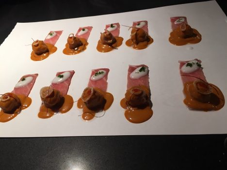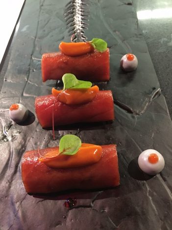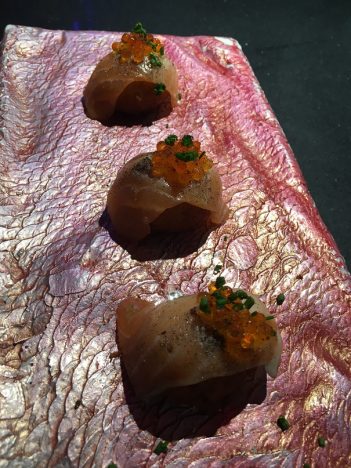 Ya que estábamos allí, probamos muchos platos de la carta. Y algunos que se van a incorporar en breve. Ya les digo que el nivel fue muy alto. Riesgo, intensidad máxima, continuos juegos con ingredientes de distintas procedencias (pero casi siempre con algo español), equilibrio, guiños al comensal y, sobre todo, mucho sabor. Ya encontramos todas estas cualidades en uno de los primeros bocados, el niguiri de arroz socarrat con atún rojo y crema de paella. En la carta se advierte que el atún procede de España.