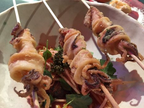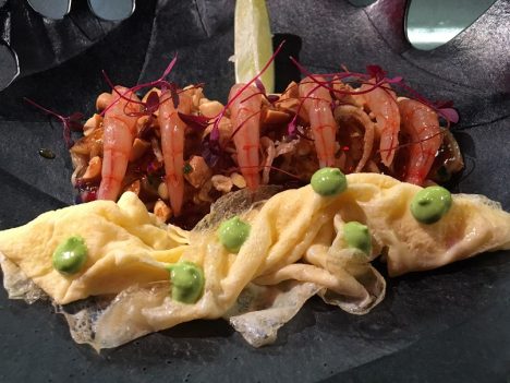 No puede haber un Streetxo sin su correspondiente chili crab. Cangrejo azul que en la carta se indica que está hecho “al estilo vasco”. Lleva chiles chipotles y una emulsión de chacolí. Tras él, los chipirones fritos a la andaluza (chipirones que también llegan desde España) con una ensalada de papaya verde, cortada la papaya en juliana. Los platos marinos acaban con el excelente pad thai de gamba roja con una emulsión de finas hierbas, setas con chile dulce y tortilla.
