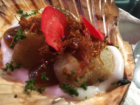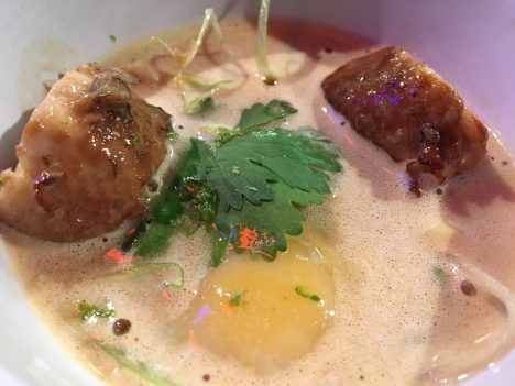 Los platos se van sucediendo en la barra desde la que dominamos el trabajo de la cocina. Carpaccio de atún rojo, arroz y curry rojo thai; vieira ahumada XO (demasiado humo) con ponzu, kéfir y coco; alitas de pollo con sus patas fritas al lado, o las croquetas “de la Pedroche” (así aparecen en la carta), unas con salmón, sus huevas y kimchi, otras con boletus, pico de gallo y trufa negra. Bocados todos muy satisfactorios.