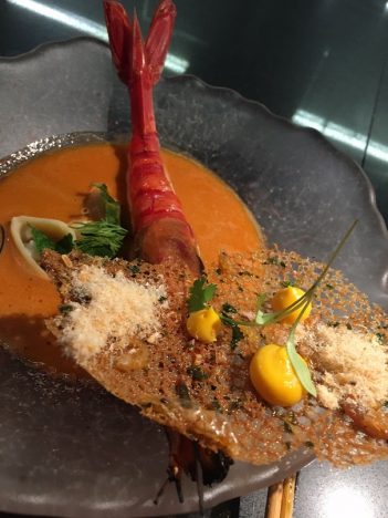 Pero lo mejor está por llegar. El ramen de pintada, con un magnífico caldo hecho con sus huesos e hígados, está para comerse una cazuela entera, lo mismo que el suquet thai de carabinero, con el crustáceo hecho en robata y acompañado también por una sutil tortillita de camarones y un alioli de azafrán.