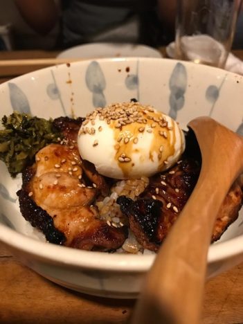 Terminamos con un arroz. En la carta, tentadores, el que va con sopa de té, o el de sardinillas secas. Optamos por el de pollo con huevo pochado, con mucho sésamo y el pollo a la brasa con salsa teriyaki. Bien mezclado en el plato, una combinación excelente. Para beber, cerveza local y un buen surtido de sakes, que se sirven en botellas enteras o en jarritas de 90 y 180 mililitros, una buena opción para probar varios. Anoten este sitio. Les va a gustar.