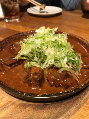 Tienen fama en Tatemichi Ya lo que llaman filetes de aguacate. Grandes trozos de este fruto pasados por la parrilla y aliñados como si fueran carne. Textura y sabor en un plato que potencia el aguacate y merece la pena probar. Como merece la pena probar la casquería, a la que los japoneses son muy aficionados. Probamos los intestinos de buey salteados con salsa teriyaki, una versión ligera de nuestros callos, buenísimos.