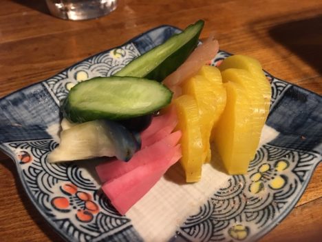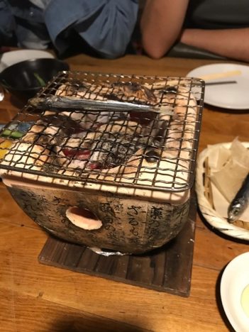 Abrimos boca con unos edamame (habituales en casi todas las cartas de restaurantes, sean del tipo que sean) y unos pickles, verduras fermentadas muy frecuentes como aperitivos o como acompañamientos (personalmente me encantan). Y seguimos con un fijo de la casa, el grill en la mesa. Una pequeña barbacoa artesanal que se sitúa en el centro y en el que cada uno asa a su gusto pescados secos que tanto gustan a los japoneses. Trozos secos de raya, de calamar, de arenque o de pequeñas bacaladillas que se pasan mínimamente por el fuego antes de comerlos con una salsa que recuerda mucho a nuestra mayonesa.