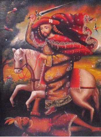 La continuidad de San Jorge, San Miguel, Matamoros y Mataindios es muy reconocible. El elemento inferior es claro: el dragón, el demonio, el moro, el indio. La postura es la misma. Las diferencias son que el moro a veces pide auxilio, muestra terror o admite la conversión. El americano aparece más dulcemente representado. Mira con aprensión, es verdad. Pero no hay terror ni amenaza. Apenas hay defensa. Sale desarmado. Hay algo colorista y naïf.