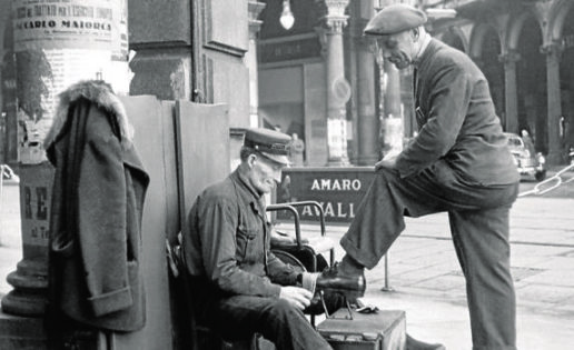 El limpiabotas, con su cosa como de dispositivo neorrealista, como de extra que algún director español se hubiera dejado olvidado en un rodaje (¡o de extra que hubiera huido de uno!), busca lo antiguo entre nosotros, lo invariable, busca entre la gente algo que permanezca, su par anacrónico.