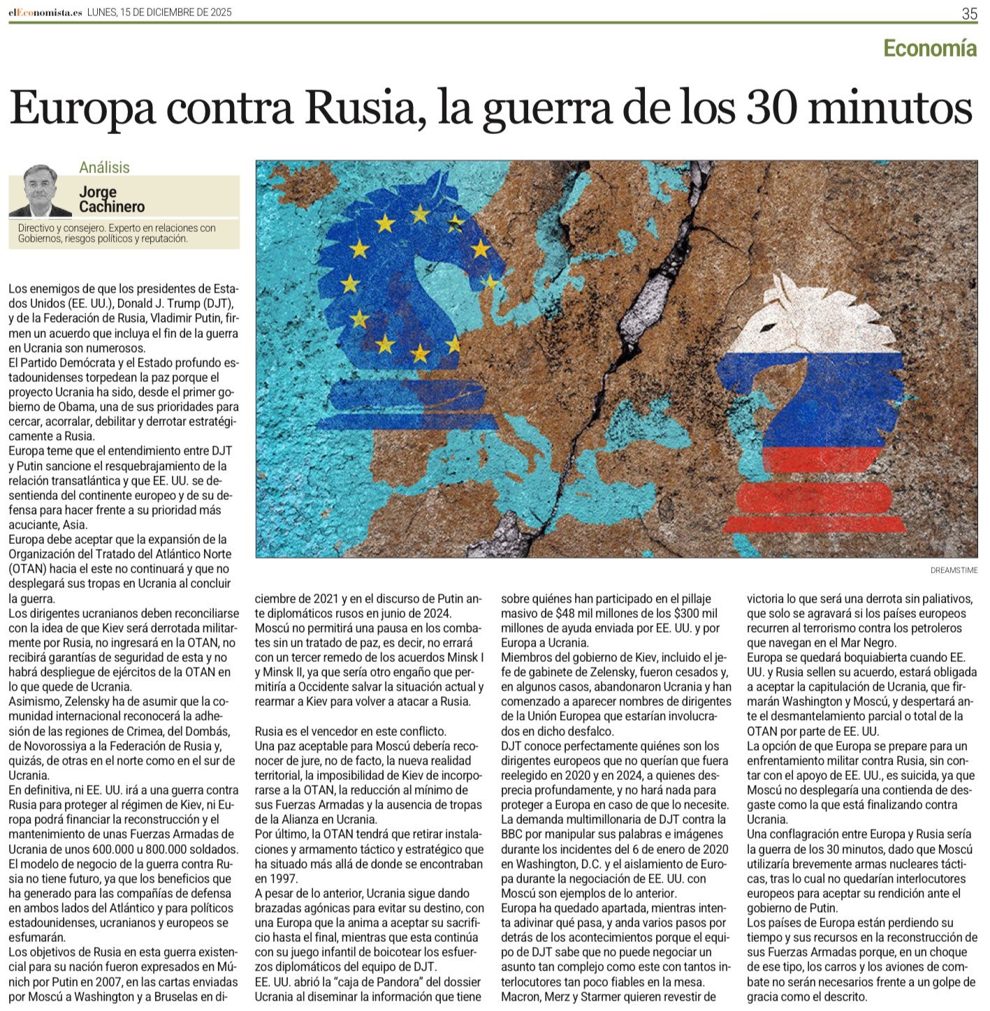 La opción de que Europa se prepare para un enfrentamiento militar contra Rusia, sin contar con el apoyo de EE. UU., es suicida, ya que Moscú no desplegaría una contienda de desgaste como la que está finalizando contra Ucrania.