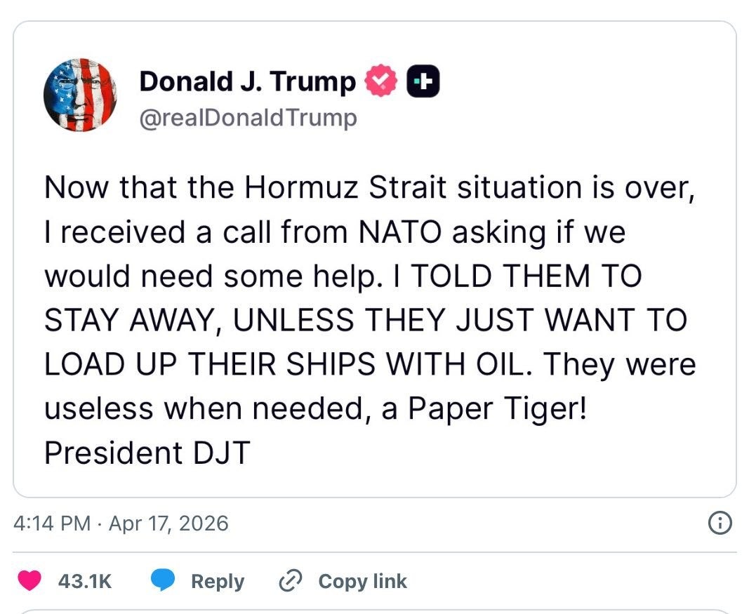 DJT calificó a la OTAN de “tigre de papel” por su comportamiento desleal hacia EE. UU. e Israel en la guerra contra Irán y culpabilizará a cualquier país o grupo de países europeos de la OTAN que quieran iniciar una guerra contra Rusia.