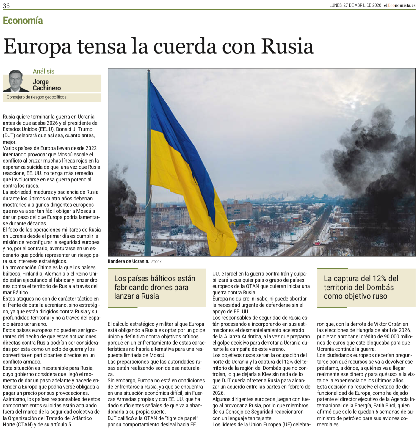 Sin embargo, Europa no está en condiciones de enfrentarse a Rusia, ya que se encuentra en una situación económica difícil, sin Fuerzas Armadas propias y con EE. UU. que ha dado suficientes señales de que va a abandonarla a su propia suerte.