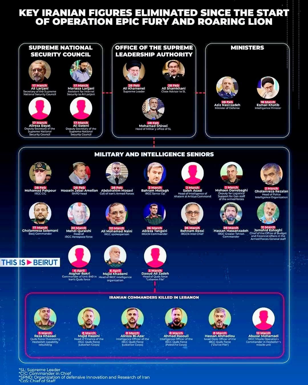 Asimismo, la jerarquía y los mandos principales de las Fuerzas Armadas, de la Inteligencia, del Cuerpo de Guardias Revolucionarios Islámicos (CGRI) y de las milicias Basij fueron diezmados en varias ocasiones.