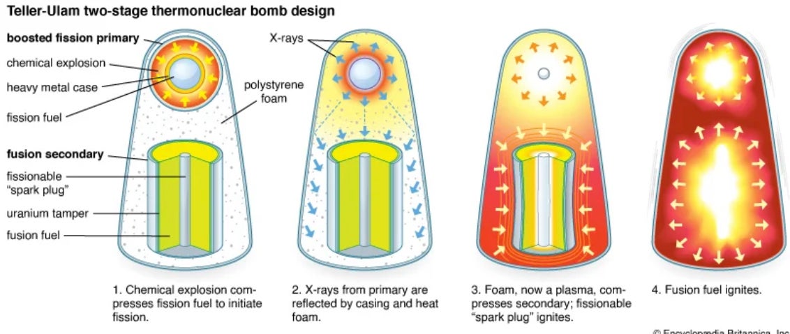 Las bombas de fusión, llamadas termonucleares o de hidrógeno, utilizarían una reacción de fisión como detonante para generar temperaturas y presiones extremas necesarias para forzar la fusión de núcleos atómicos más ligeros y liberar aún más energía.