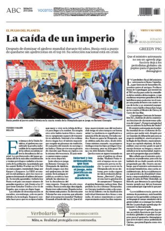 Justo ahora se juega en Batumi (Georgia) la Olimpiada de Ajedrez, donde juegan casi dos mil ajedrecistas de 180 países. En la antigua república soviética han saltado las alarmas sobre la decadencia del viejo imperio. Después de solo cinco rondas, Rusia ya está algo descolgada. Hasta trece selecciones (España incluida)tienen más puntos. Su derrota ante Polonia fue una sorpresa que además dejó al excampeón mundial Vladimir Kramnik al borde del top 10 en la clasificación virtual, con un margen mínimo sobre el chino Yu Yangyi, que ni siquiera es conocido (todavía). Que el último superviviente ruso del exclusivo club tenga 43 años tampoco es buena señal.