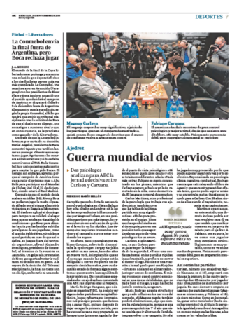 María Rodrigo Yanguas, que además de psicóloga es maestra FIDE, ha podido ver alguna de las partidas en la capital británica, lo que refuerza sus impresiones: «Al principio pensaba que Carlsen iba a ganar fácil, incluso después de dejar escapar la primera partida, pero he visto a Caruana muy preparado en las aperturas y desde el punto de vista psicológico». «Mi sensación es que la pose de uno y otro es totalmente diferente», añade. «Nada más entrar, Fabiano se sienta concentrado en las piezas, mientras que Carlsen aparece echado a un lado, recostado en la silla, como desmotivado. El lenguaje corporal dice mucho».