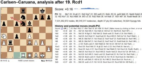 Magnus es el primero que se para a pensar, en la jugada 17. El superordenador Sesse, pese a su procedencia noruega, otorga a Caruana algo de ventaja (cerca de un peón, +1.05), con admirable objetividad.