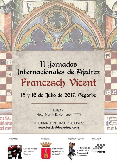 Por el lado competitivo, el Maestro FIDE venezolano José Manuel Díaz se impuso en la segunda edición del Abierto Ciudad de Segorbe, que por si alguien la desconoce, se halla en la Comunidad Valenciana, al sur de la provincia de Castellón. El torneo estuvo organizado por el club Alto Palancia en homenaje a Francesch Vicent, ilustre hijo de Segorbe y uno de los padres del ajedrez moderno, ya que ayudó a propagarlo por el mundo a finales del siglo XV. Un total de 70 ajedrecistas compitieron en la prueba.