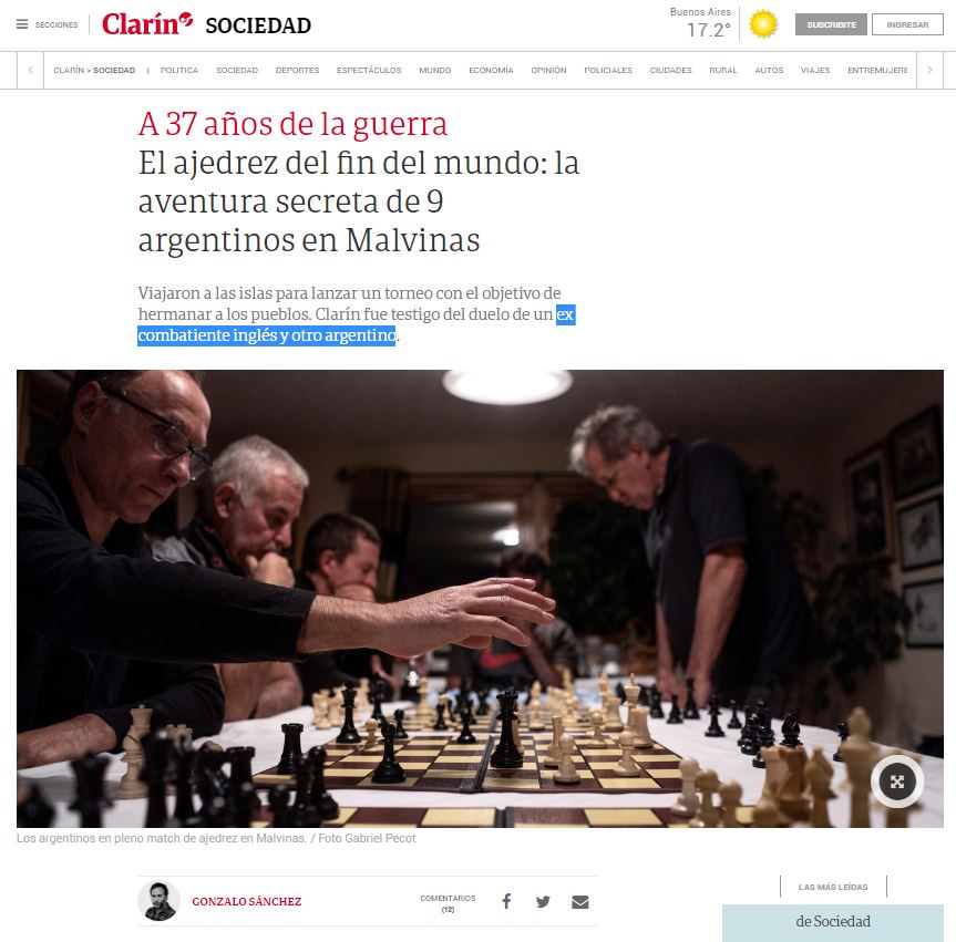 Los menos jóvenes no habrán olvidado la guerra de las Malvinas (Falklands War, para los británicos) de 1982. Hace justo un año, Pablo F. de Mera Alarcón recordaba en ABC la contienda y apuntaba esto: «No fue únicamente un campo de batalla, más bien se trató de un tablero de ajedrez que contó con Galtieri y Thatcher –y sus respectivos intereses políticos– como jugadores. La victoria fue de la primera ministra británica, sin duda más hábil». Para confirmar la metáfora, hace unos días la FIDE decidía intervenir en el último capítulo de la guerra entre argentinos y británicos. La Federación Internacional negó el valor oficial de las partidas organizadas por la Federación Argentina de Ajedrez en los territorios en disputa. Fueron dos torneos y un duelo personal, entre un excombatiente inglés y otro argentino, un teniente y un mayor. Independientemente de las intenciones y de la repercusión posterior, quedó claro que la única guerra buena es la del ajedrez.