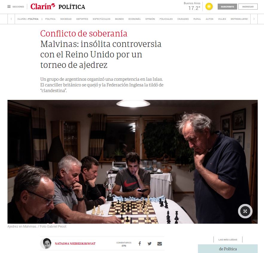 El escueto comunicado de la Federación Internacional decía así: «La FIDE ha recibido una protesta debido a que entre septiembre de 2018 y marzo de 2019 se han celebrado dos torneos y un duelo de ajedrez en Stanley –Puerto Argentino para el otro bando–, en los territorios británicos de ultramar de las islas Falkland, cuyos resultados fueron remitidos por la Federación Argentina para su consideración en la puntuación Elo. Las federaciones tienen el derecho exclusivo de enviar resultados de torneos que se celebren en su territorio. Debido a que esto no se hizo, y a que ni siquiera se solicitó permiso ni informó a la Federación Británica, en cuyo ámbito se encuentran las islas Falkland, la Comisión de Clasificación de la FIDE excluirá los resultados de estos torneos». La FIDE instó asimismo a todas las federaciones a «no utilizar los torneos de ajedrez con fines políticos».