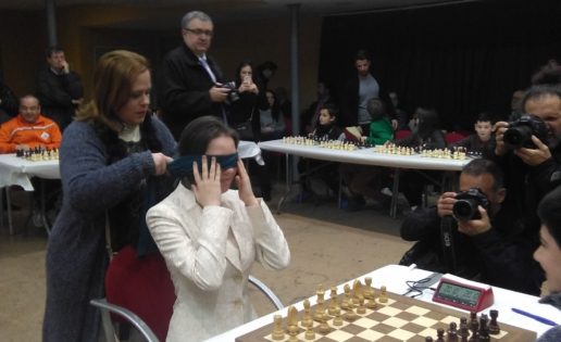 La exhibición pudo seguirse en directo a través de la web ajedrezvalenciano.com. Pese a no poder ver el tablero (salvo en su mente), Muzychuk derrotó a José García Molina, de 11 años, campeón nacional sub 12 y campeón de España por equipos sub 12 con el club de Silla. La ucraniana reconoció que no le resultó nada fácil ganar la partida, debido a la «interesante» apertura que le planteó su joven rival. Su principal dificultad fue calcular muchas jugadas, sobre todo teniendo en cuenta que debía recordar la situación de las piezas de memoria.