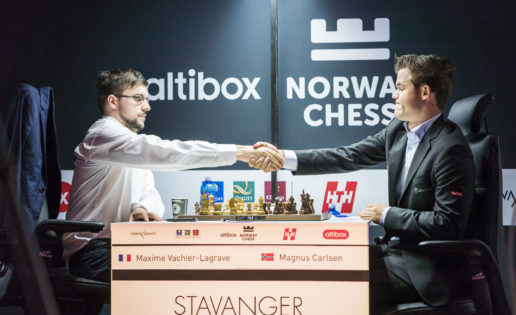 Fotografía de Lennart Ootes, correspondiente a la última ronda del Altibox Norway Chess de 2018. Vachier-Labrave y Carlsen firmaron tablas