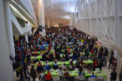 La competición, en todo caso, siguió sin mayores sobresaltos, sobre todo cuando el tiempo mejoró y se habilitó una carpa para los acompañantes, con pantallas para observar la sala, un pequeño bar, tableros para jugar un una tienda con material y ropa relacionados con el ajedrez. Incluso vi a un niño que aprovechaba para hacer los deberes después de la partida. En la Ciudad de la Cultura, un lugar modernísimo y grandilocuente, también hay una biblioteca y un pequeño museo, por otro lado, que ayudaba a algunos a matar el tiempo.
