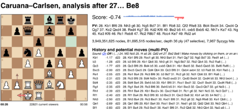 Entretanto, la máquina cree que las negras está ligeramente mejor, ventaja que se dispara con la jugada 25 del americano, un movimiento ofensivo de peón que posiblemente es un error grave. Si Carlsen acierta en las próximas jugadas, el título podría estar decidido. De entrada, hace un movimiento, también de peón, que disipa gran parte de su ventaja (siempre según la fría y abstracta evaluación que hacen los programas).