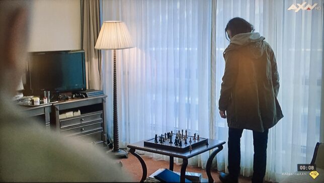 Ya hemos hablado aquí sobre el ajedrez de tres pisos de «Big Bang» y pudimos ver un vídeo de recopilación con 101 mates de cine, algunos brillantes y otros desastrosos. En los últimos tiempos, quizá solo sea una falsa percepción, he detectado un incremento de escenas ajedrecísticas en el cine y la televisión, por no hablar de los títulos directamente dedicados a nuestro juego y de la publicidad. He aquí una pequeña muestra, que espero que crezca poco a poco.
