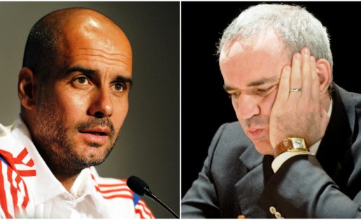 En el libro «Herr Pep», Martí Perarnau hace una «crónica desde dentro» del primer año de Pep Guardiola en el Bayern Múnich. En sus más de 400 páginas, el deporte protagonista es el fútbol, como es natural, pero el autor dedica el primer capítulo a hablar de ajedrez y de Garry Kasparov. Resulta que Pep trabó amistad con el ruso durante su año sabático en Nueva York. Más adelante, el entrenador y exfutbolista llega a admitir: «Cada vez me interesa más el ajedrez».