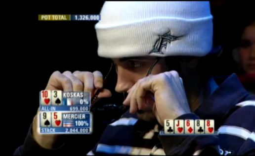 Mercier se quita las gafas, estudia la situación, mira a su rival, el francés Eric Koskas, repasa la secuencia de movimientos y decide ver la apuesta, ante el gesto atónito de su rival, que se había jugado un farol con aire bajo en oxígeno, y de algún compañero de mesa. Ambos jugaban el European Poker Tour de San Remo en 2008, cuando Mercier era prácticamente un desconocido. Con aquella mano, además de eliminar a su enemigo, el estadounidense recibió un gran impulso hacia la victoria y  su primer gran premio en vivo, 869.000 euros.