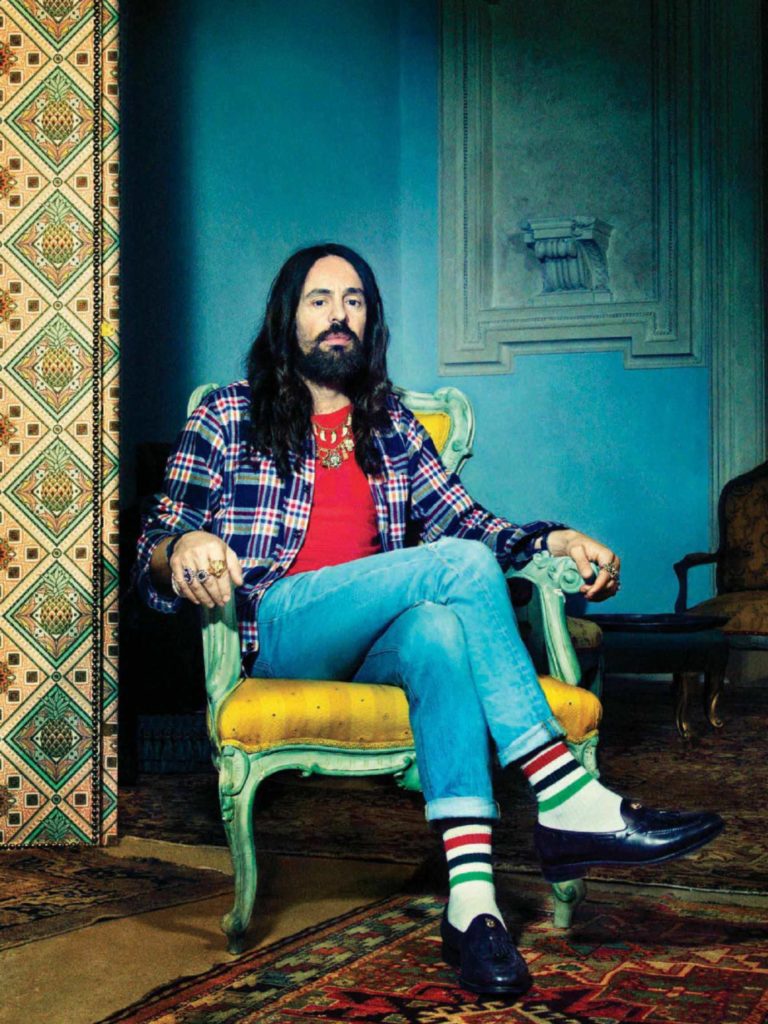 Con ecos de los años setenta y un estilo retro que alababa al Gucci antiguo y creativo de los inicios, Michele combinó colchas de toile de Jouy, alfombras persas y turcas, terciopelos en las chaquetas, telas adamascadas y material de cuadros escoceses. Y arrasó en un desierto de diseño purista y limpio.