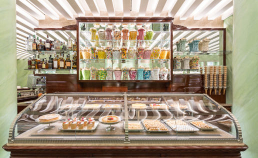 Prada ha comprado el 80% del accionariado de esta tradicional pastelería milanesa de casi 200 años de antigüedad. El arquitecto, Roberto Baciocchi, al igual que el equipo gestor, son del habitual grupo de directivos de Prada. El verde Prada de las paredes combina con el colorido de cajas y pasteles como las tiendas de moda del grupo.