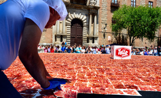 La ciudad de Toledo, Capital Española de la GastronomÃa 2016, ha conseguido el record Guinness al plato de jamón cortado más grande del mundo. Las cifras cantan: 392 kilos de jamón en lonchas sacadas de 112 jamones por 76 cortadores de toda España; porciones de entre 100 y 200 gramos que colocadas una junto a otra cubrieron una superficie de 140 m².