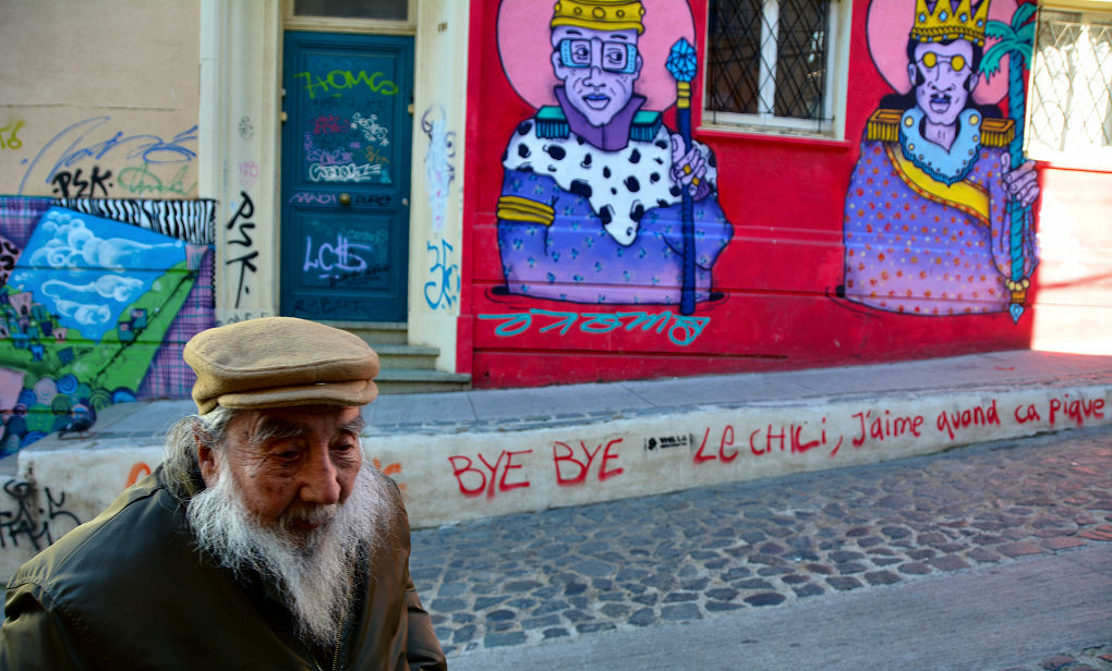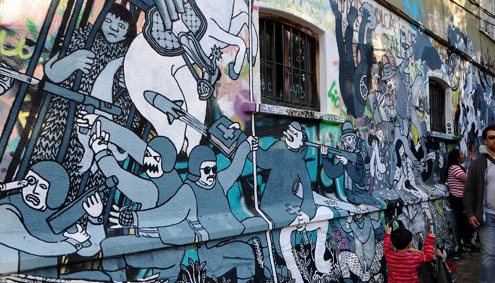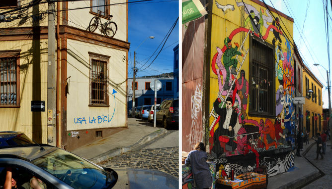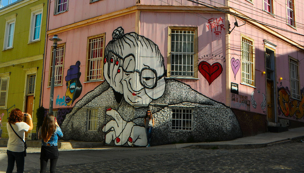“Museo a cielo abierto”, capital chilena del graffiti, muchas de las fachadas de Valpo están cubiertas por murales de todo tipo y condición. El primero, de 1963, pedía el voto para Salvador Allende. Hoy otro recomienda “Usa la bici”. Han pasado muchos años y muchas cosas. Después del gran incendio de 2014, que acabó con buena parte de las casas de estos cerros, se organizaron “mingas” de trabajo (especie de cooperativas voluntarias) para pintar nuevos murales. Hoy hay más de dos centenares.